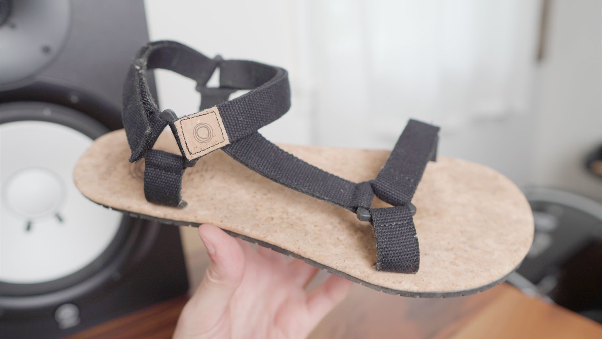 Vegan barefoot sandal with cotton straps, cork, and firm ground tread for casual hiking.