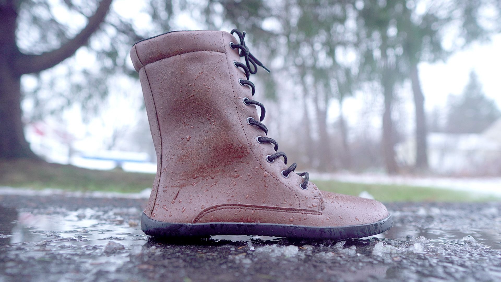 Winter barefoot boot with ethical vegan leather upper, high cut, minimal tread, and wide, foot-shaped toebox.