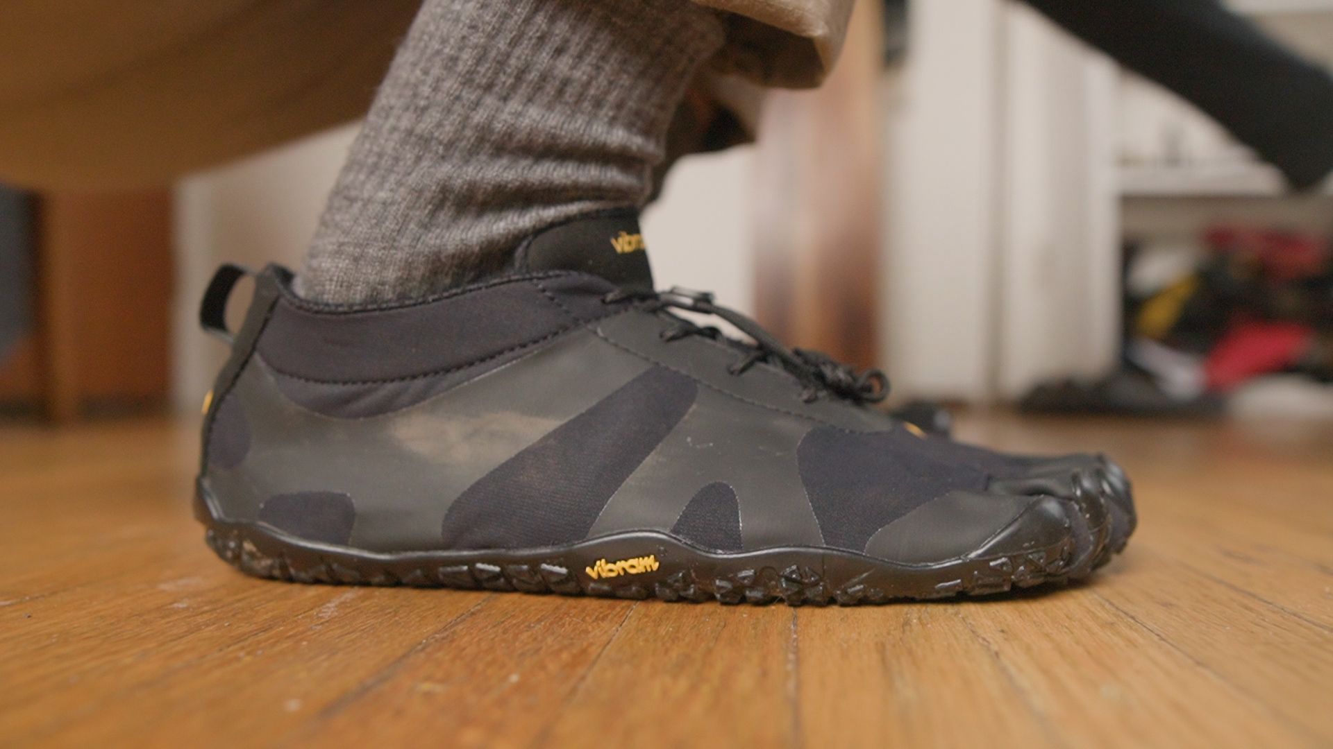 Hello, my name’s Andrew and these are the Vibram FiveFingers V-Alpha, a lightweight barefoot toe shoe with a wool blend upper and aggressive tread for hiking and running on roads and trails.