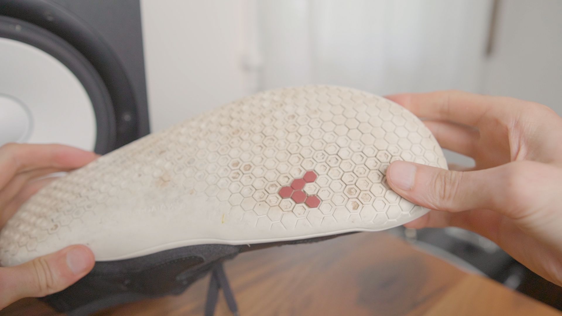 Underneath you’ve got a thin 4mm zero-drop sole with excellent flexibility in all directions and a minimal hex tread that’s denser at the forefoot and edges to prevent abrasion on concrete and pavement.