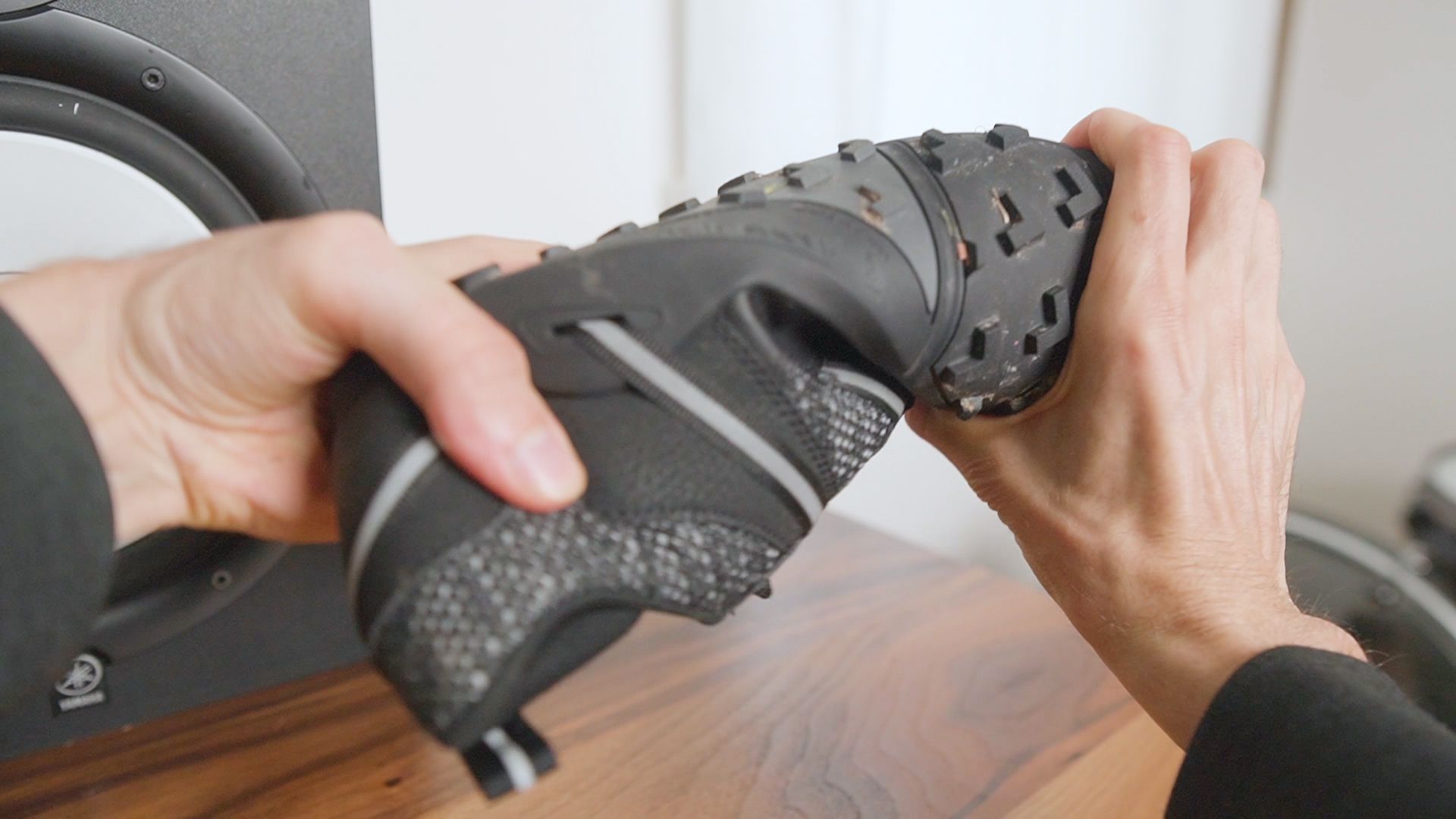Underneath you’ve got a 6.5mm sole with moderate flexibility in both directions, plus a reinforced heel, 3mm layer of foam padding, and an aggressive tread for hardcore traction on slippery surfaces.