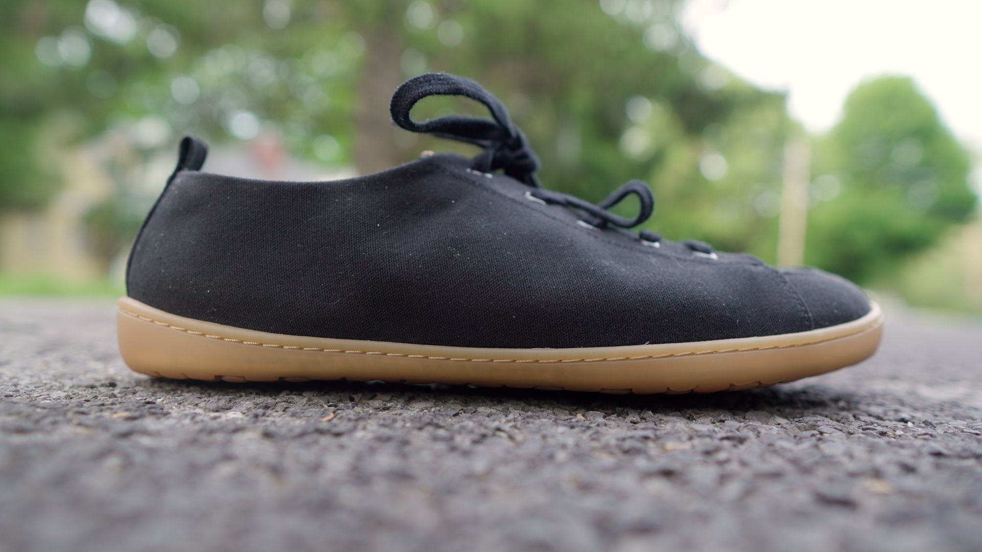 Barefoot shoe with thin 4mm sole, 3mm cork insole, medium width toebox, and leather upper.