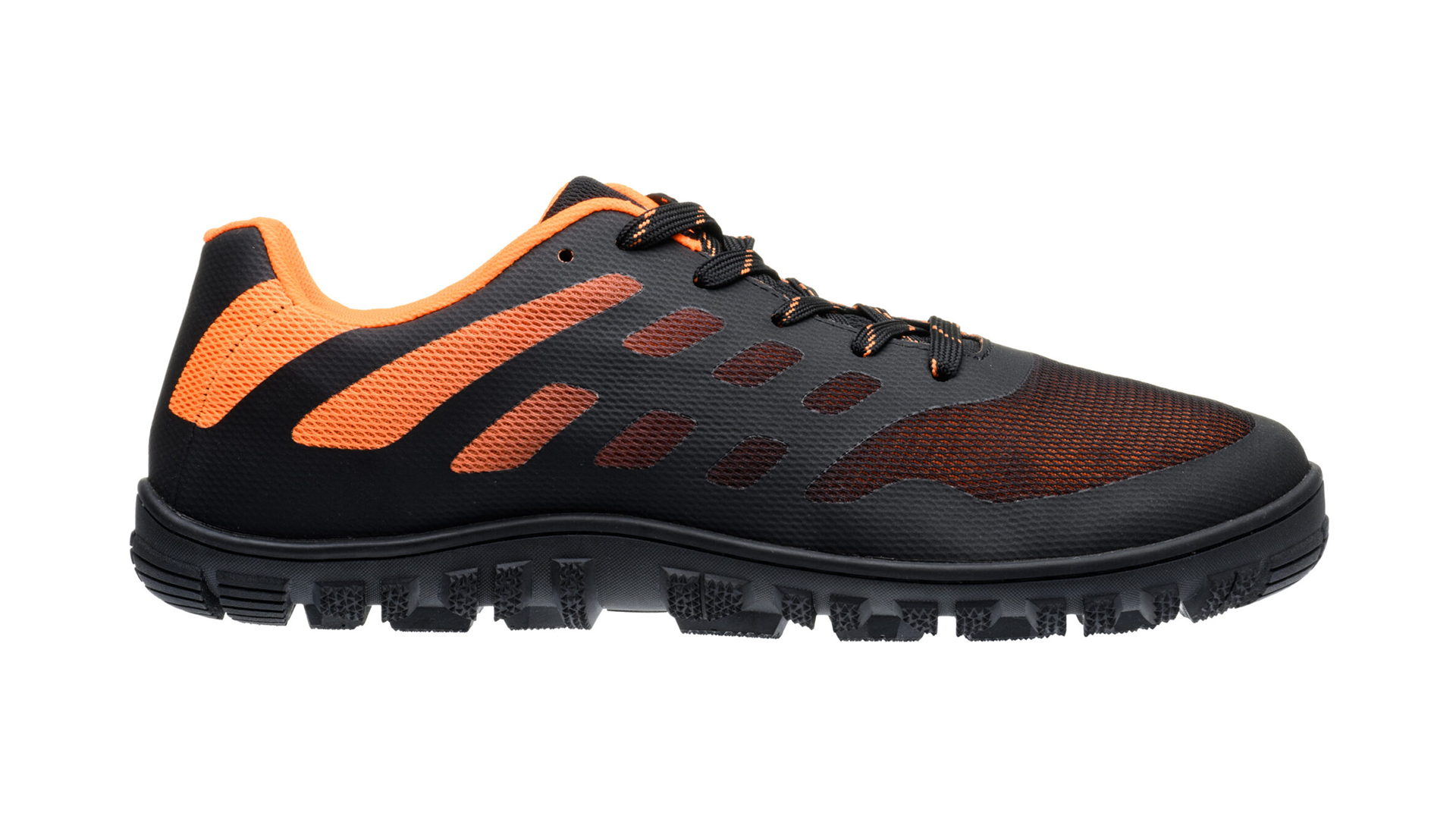 Barefoot trail shoe with a 8mm sole, wide mesh upper, and aggressive tread for soft ground.