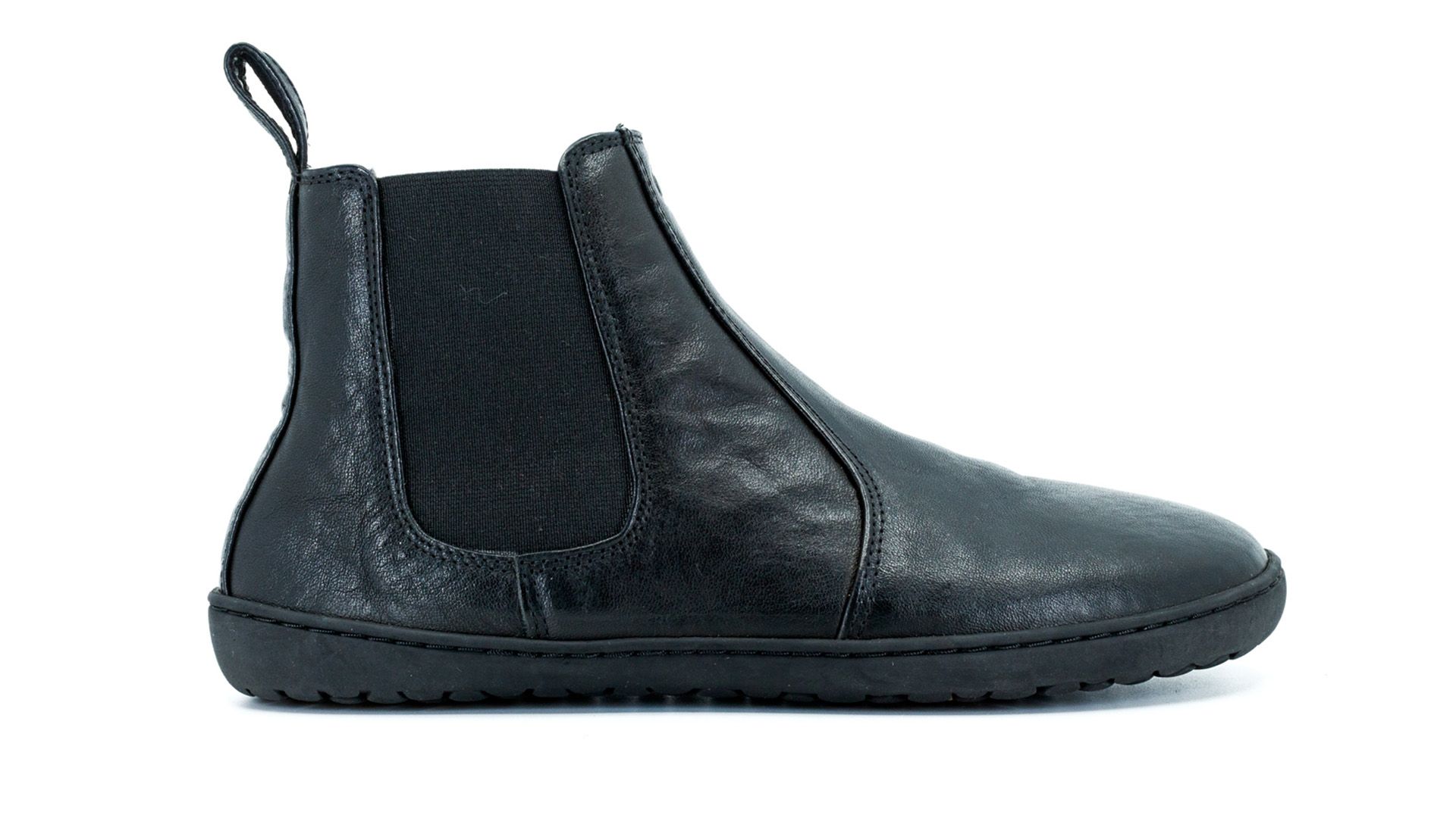 Barefoot Chelsea boot with a 3.5mm sole, extra-wide slip-in leather upper, and minimal tread.