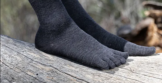 Wool liner socks with seperate toes, ethical merino, subltle arch compression, stretchy material, and wide fit.