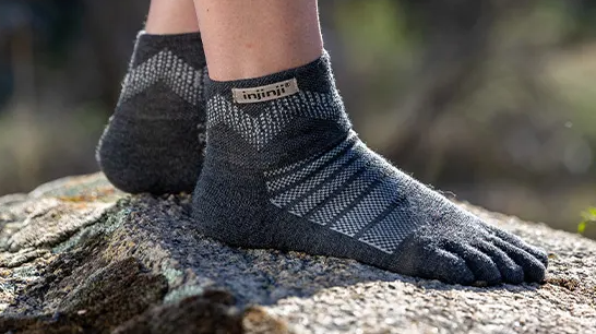 Medium thick ankle height merino wool toe socks made with ethical fabric for hike and run.