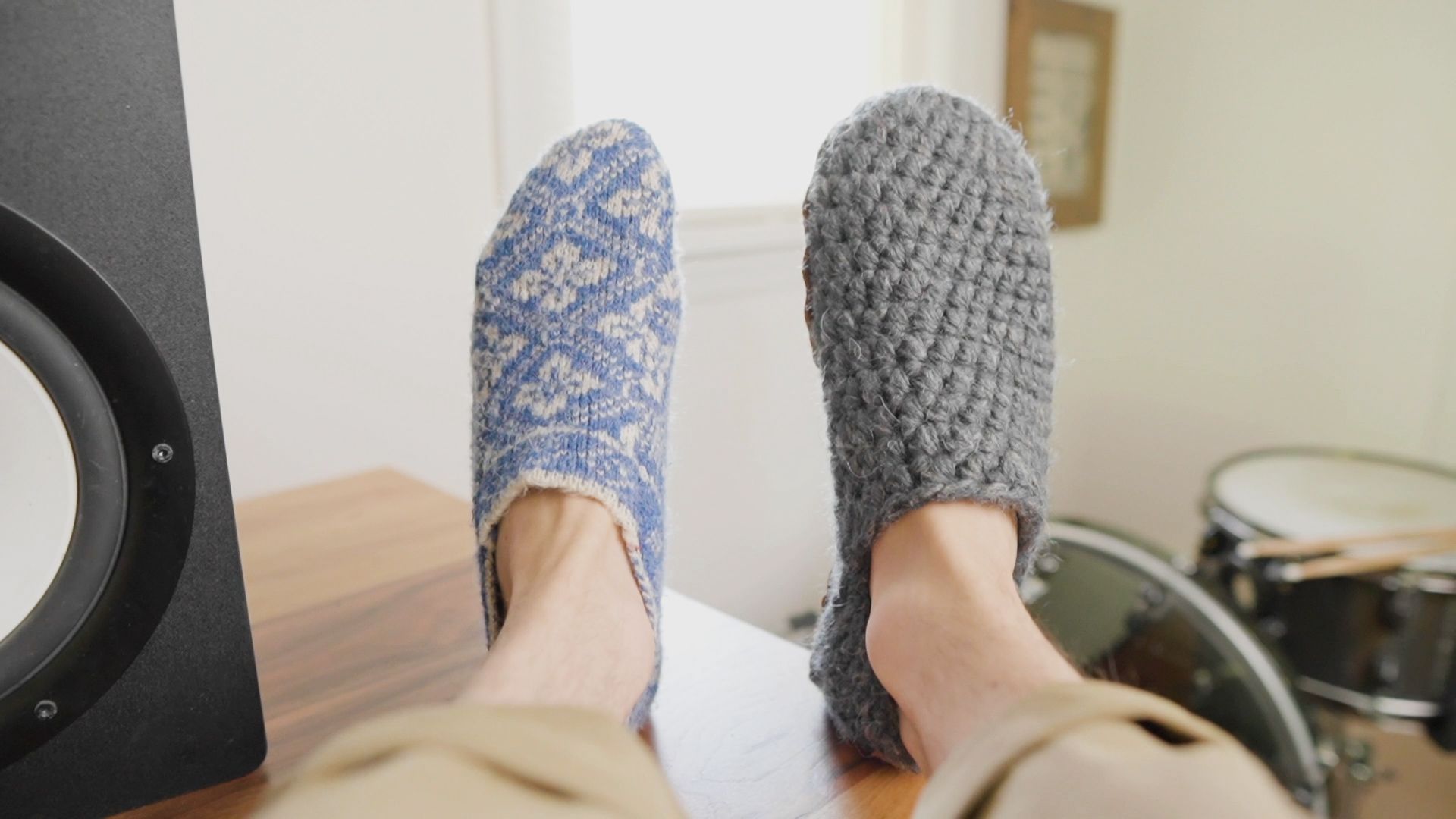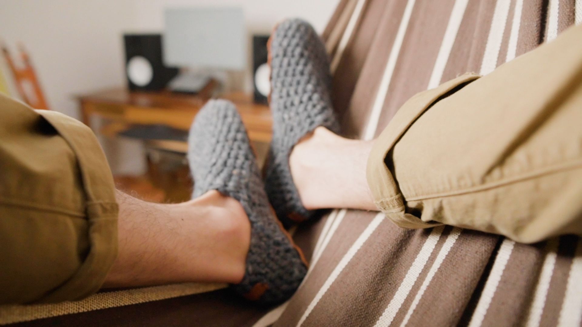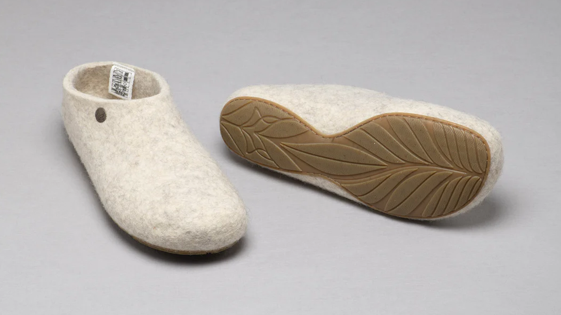 Ankle-height wool slippers with thin rubber crepe sole for grip, medium width, rounded toebox, pull tab, and non-toxic dyes.