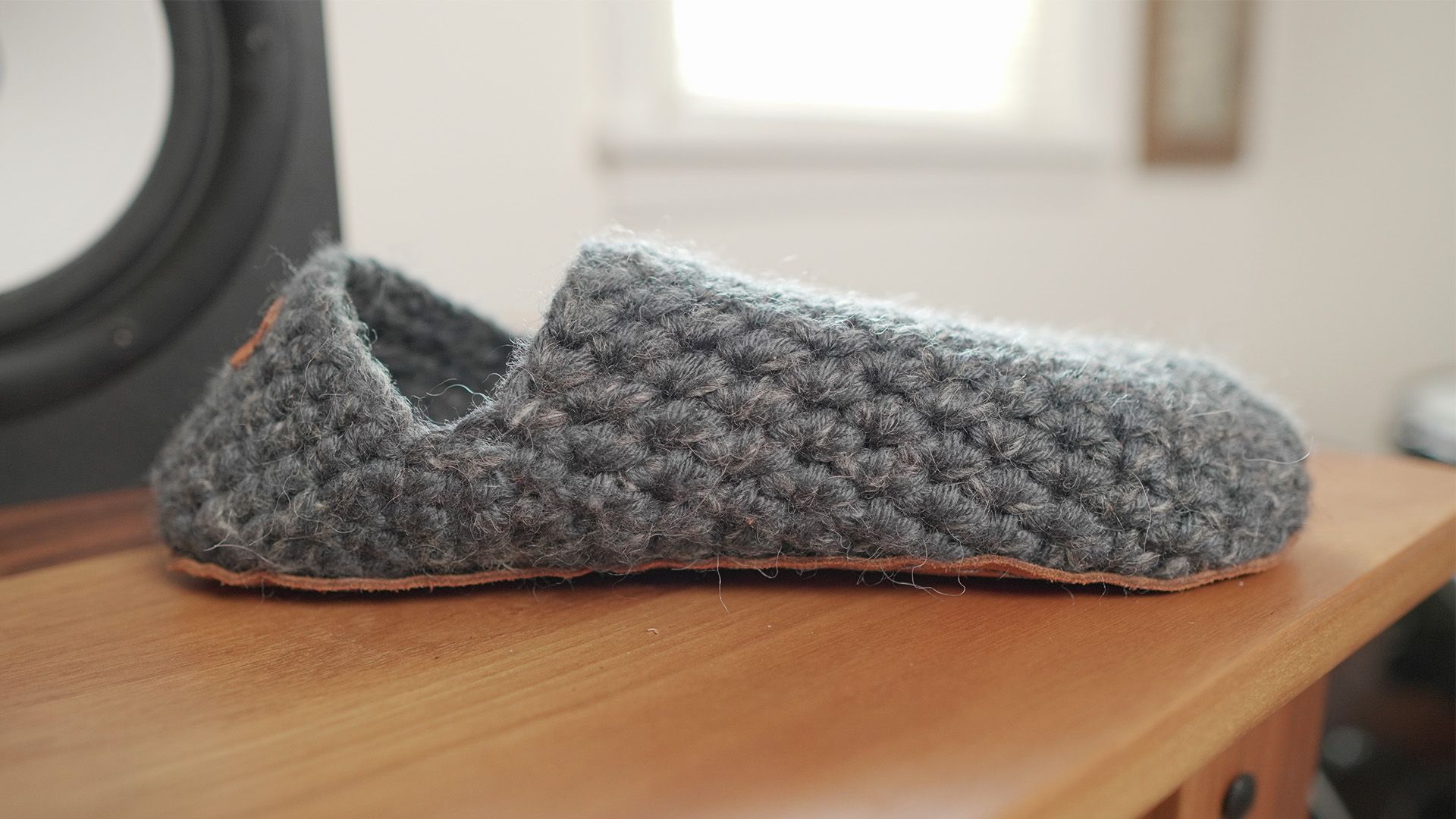 Ankle-height wool slippers with thin rubber crepe sole for grip, medium width, rounded toebox, pull tab, and non-toxic dyes.