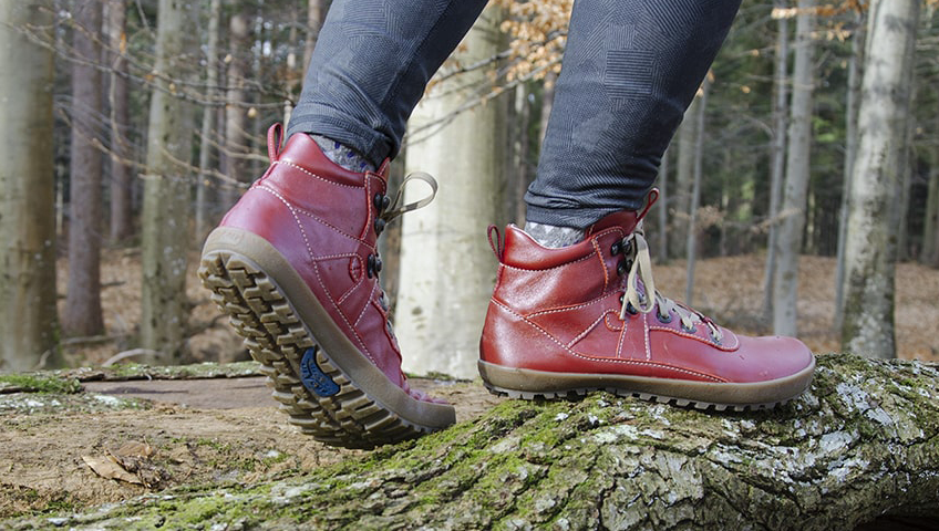 Barefoot ankle boots with thin 2.5mm sole, 5mm layer of wool and aluminum foil for insulation, semi-aggressive tread for trails, leather upper, tie laces, and wide, foot-shaped toebox.