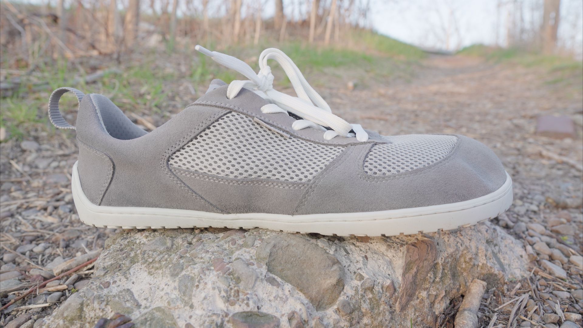 Barefoot hiking shoe with 4mm sole, extra-wide toebox, minimal tread, and leather upper.
