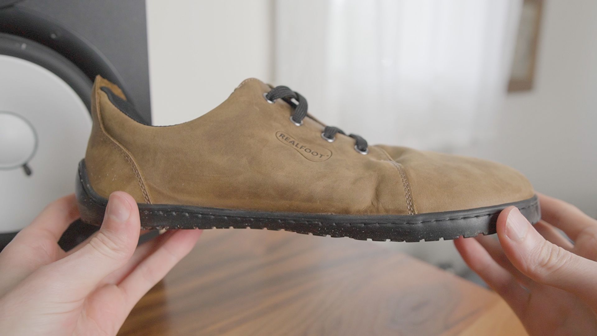 Barefoot shoe with thin 4mm sole, 3mm cork insole, medium width toebox, and leather upper.