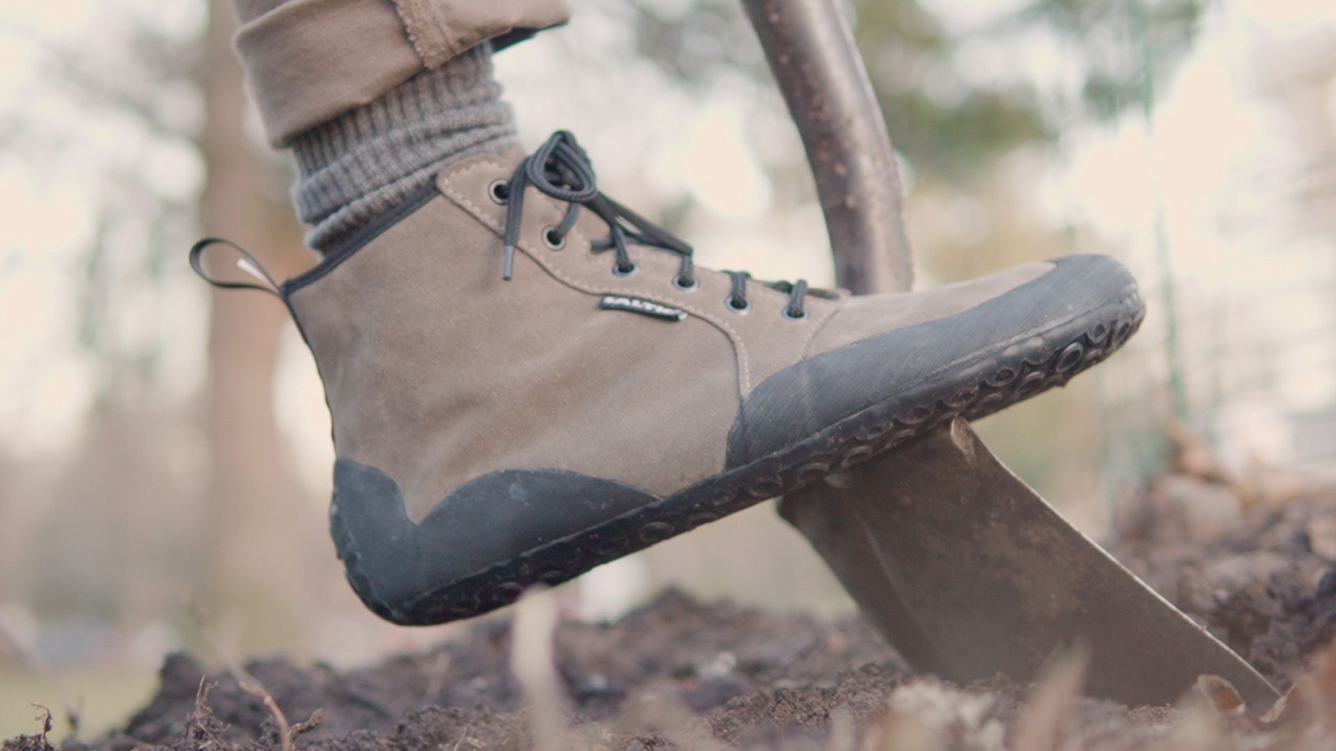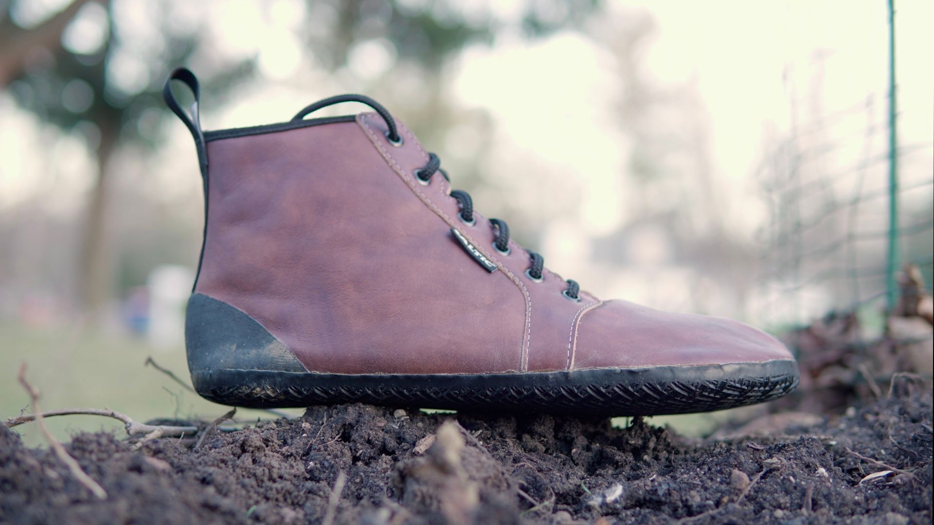 Barefoot hiking shoe with 3.7mm Vibram sole, wide toebox, and water-resistant leather upper.
