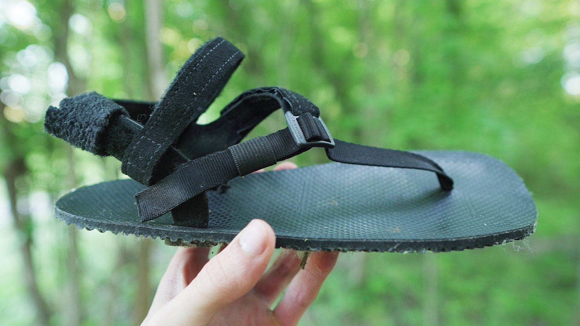 Barefoot trail running sandal with a thin 5–6mm hybrid sole, extra straps, and wide toebox.