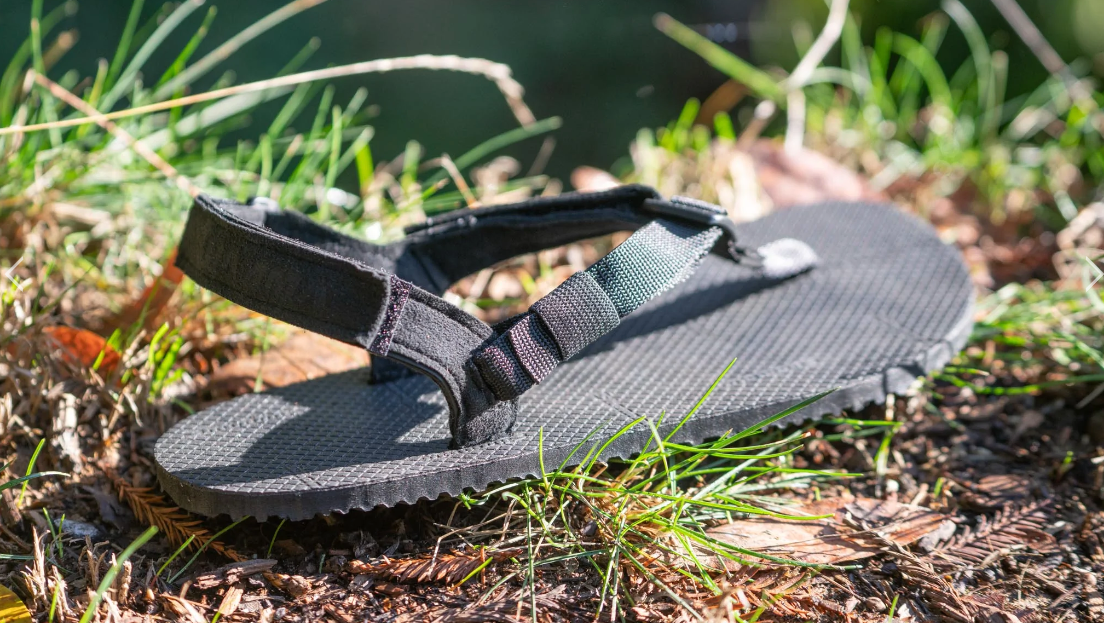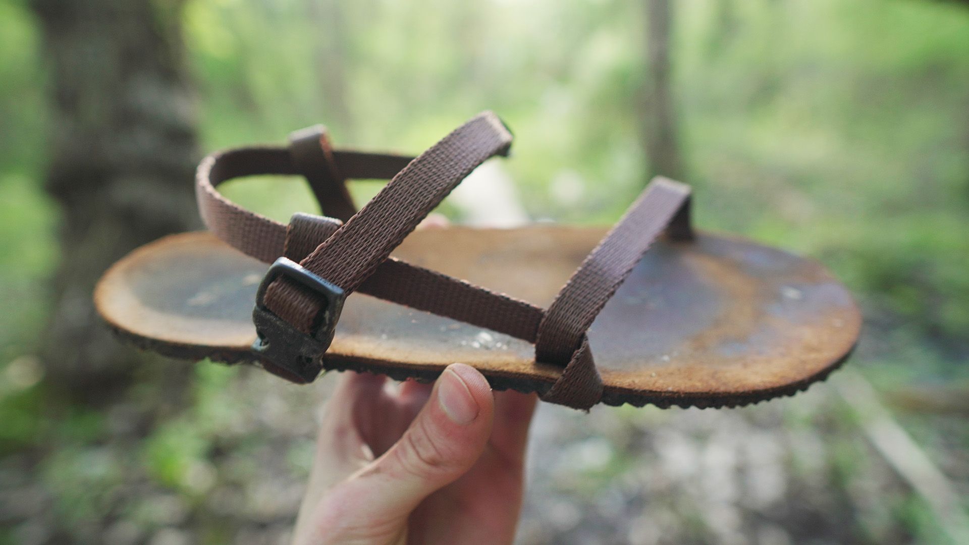 Summary: Trail sandal with 9mm Vibram sole, goatskin leather footbed, velcro ankle strap, toe thong, semi-aggressive tread, and wide, foot-shaped toebox.