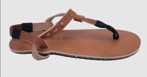 Handmade barefoot sandal with leather or synthetic footbed, 5.7, 7.8, or 9mm Vibram sole, semi-aggressive tread, leather button strap and thong, and wide, foot-shaped toebox.