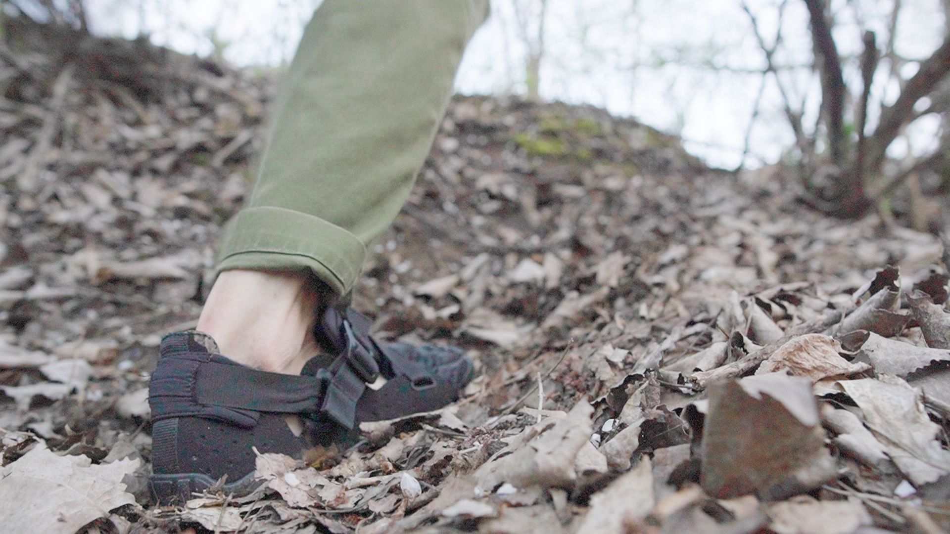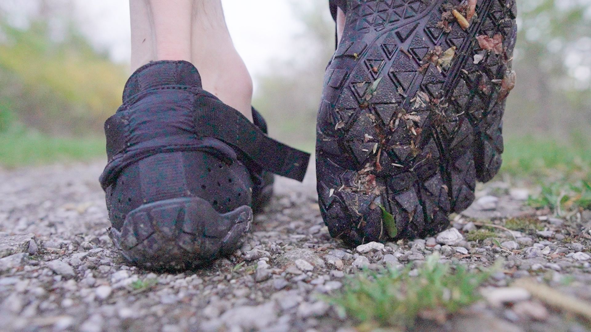 Barefoot trail shoe with a wide breathable upper, drawstring, and deep lugs for wet terrain.