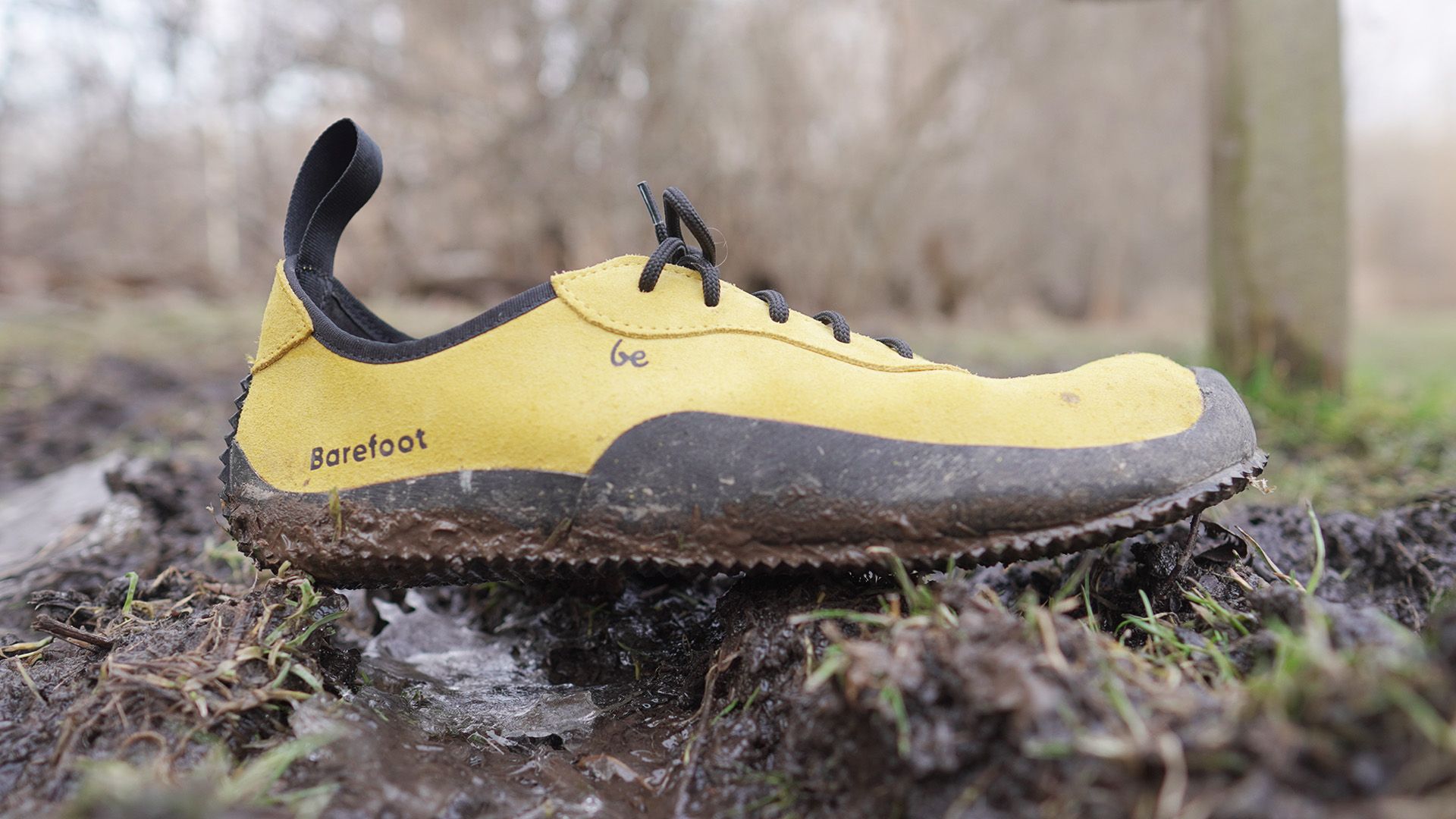Barefoot hiking shoe with 4mm sole, extra-wide toebox, minimal tread, and leather upper.
