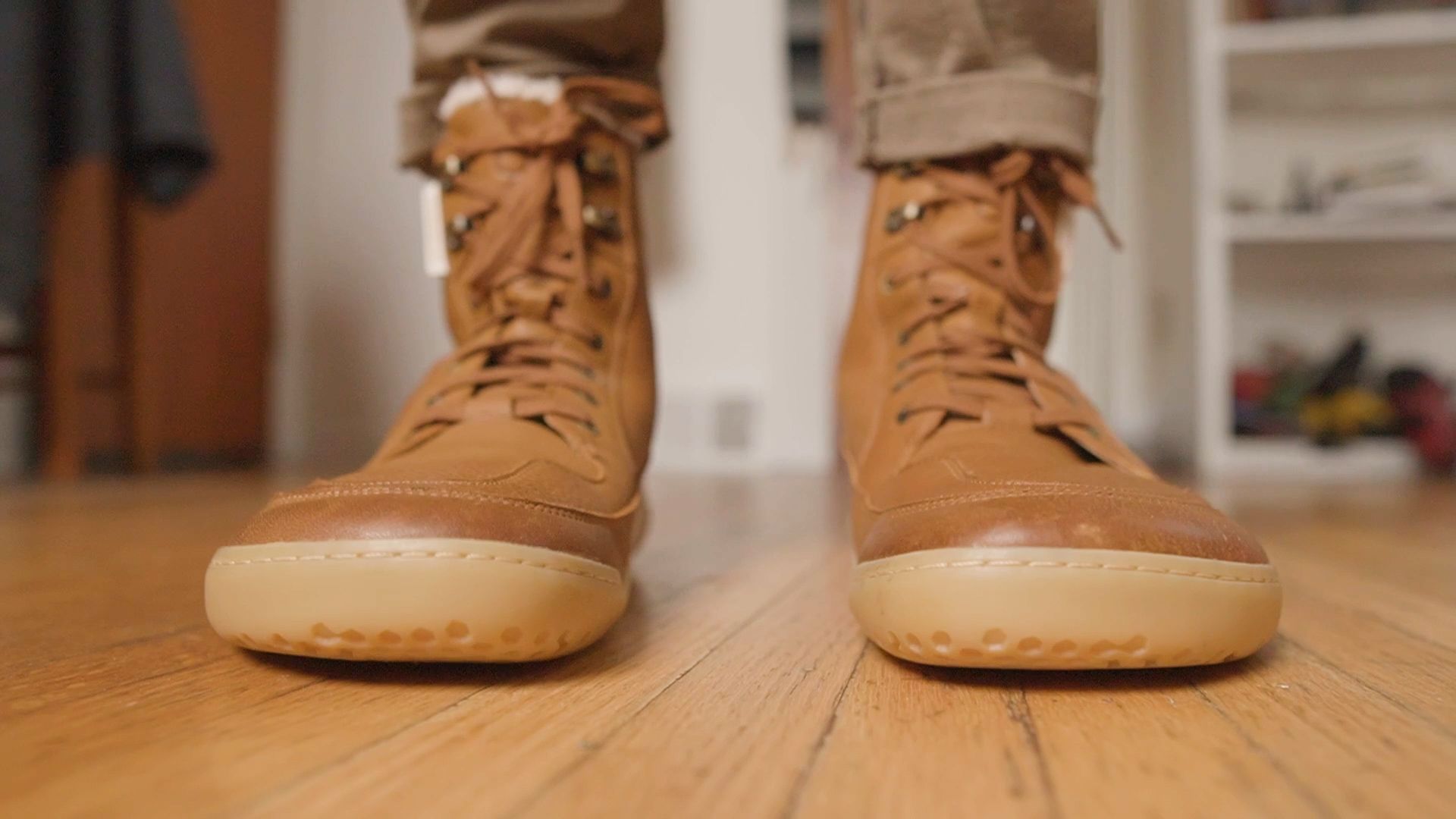 Barefoot boot with a thin 3.7mm sole, wide water-resistant leather upper, and casual tread.
