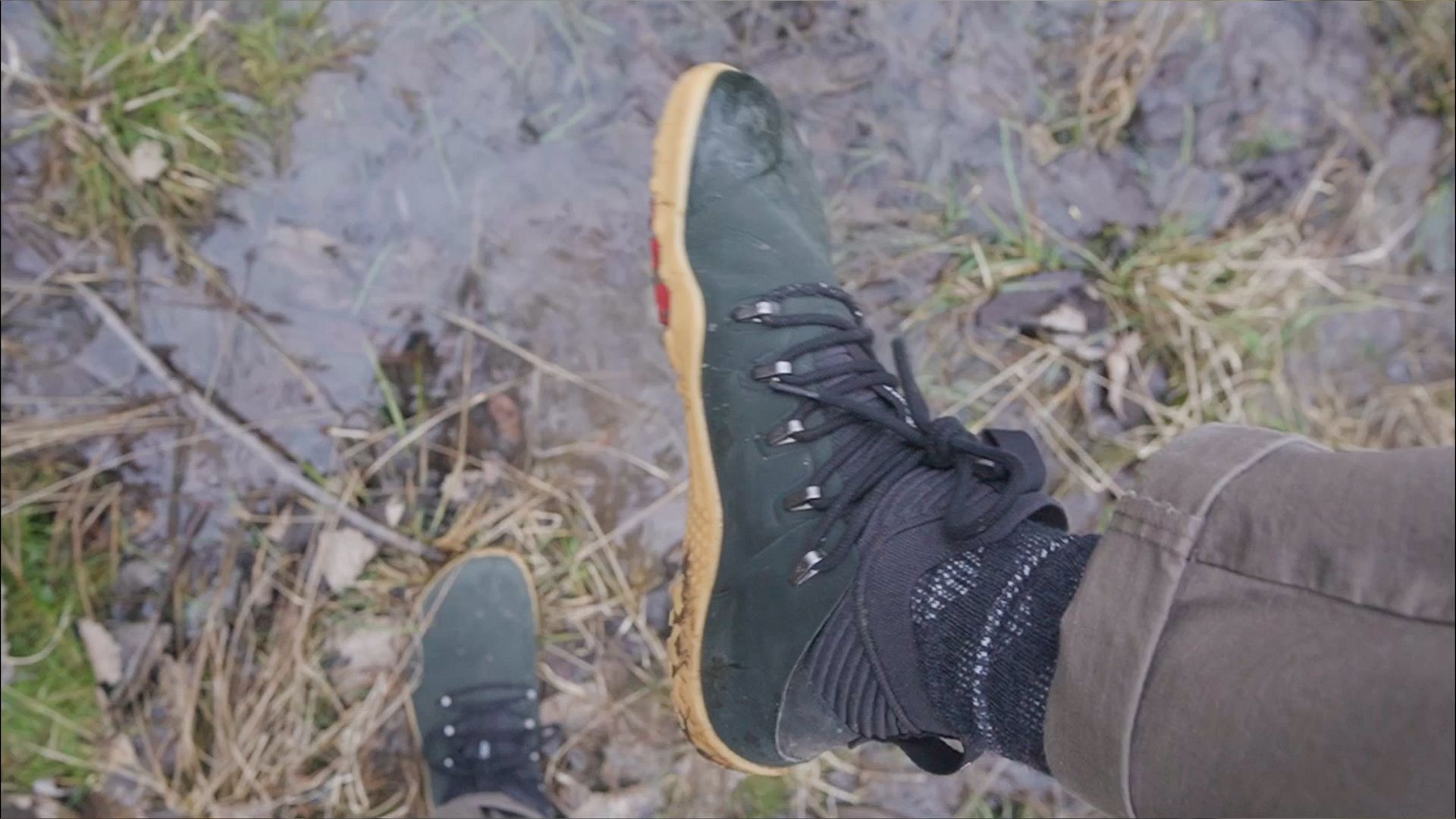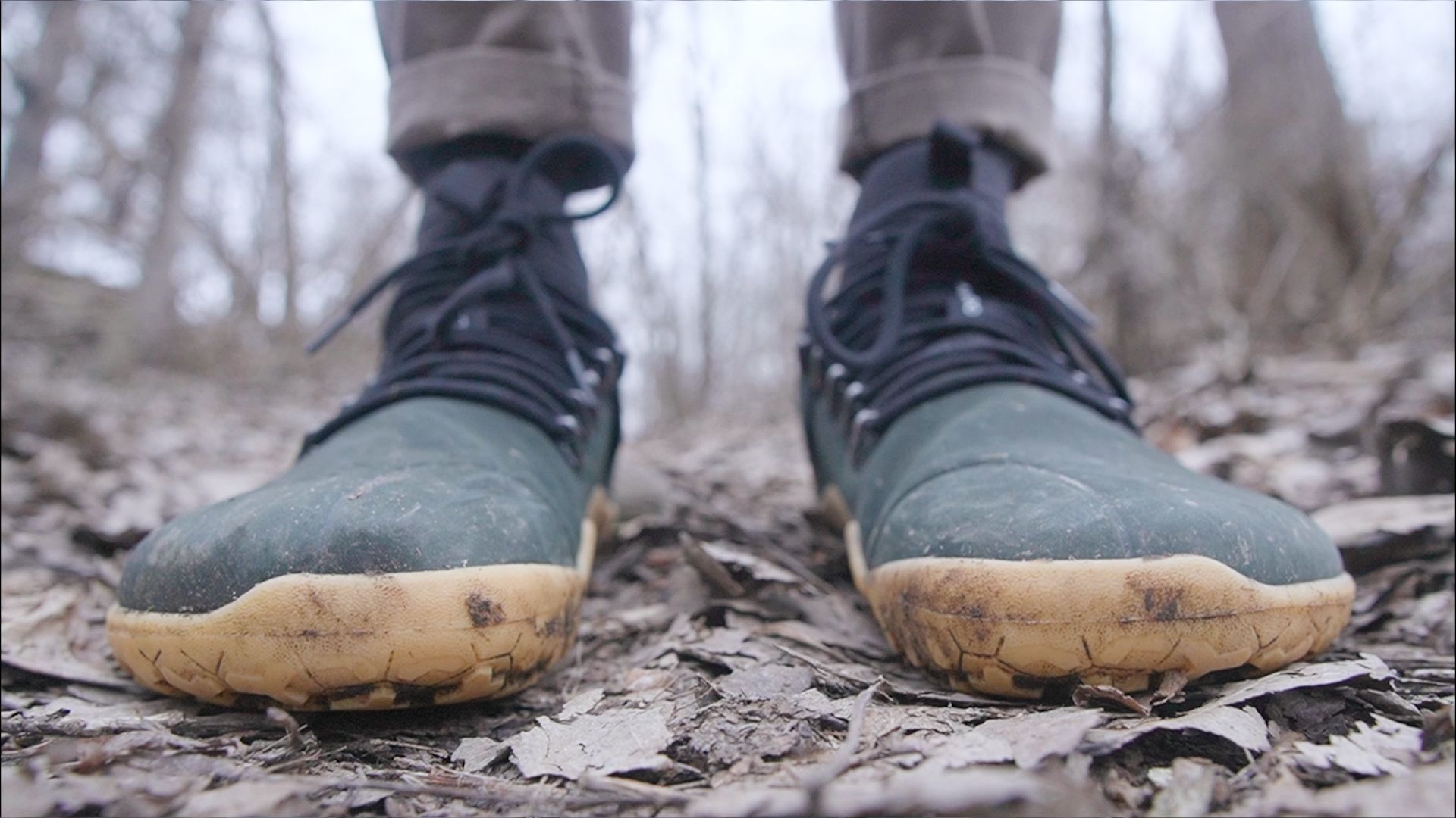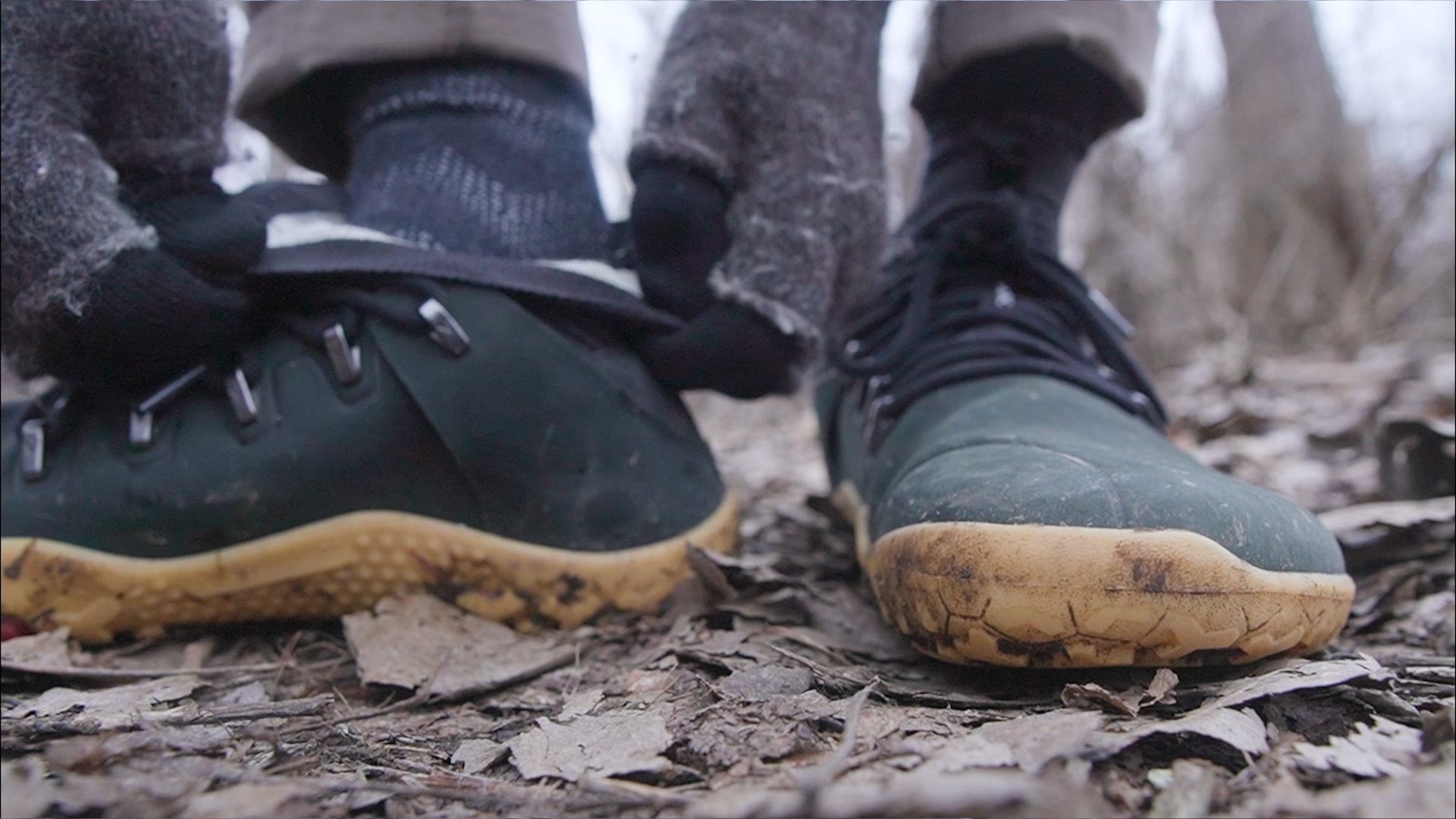 Summary: Barefoot hiking boot with a 5.5mm sole, wide, flexible leather upper, and firm ground tread.
