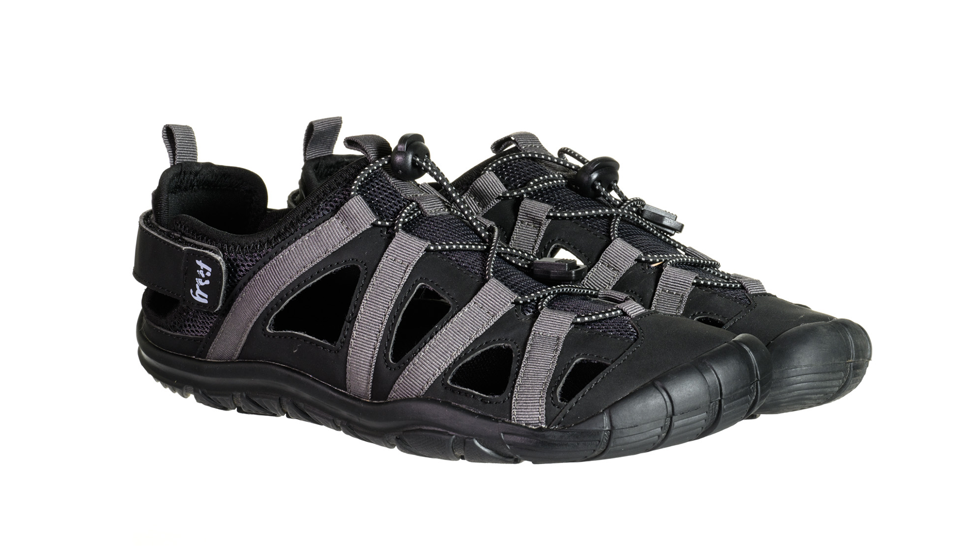 Barefoot trail sandal with a 4mm sole, semi-open upper, and hybrid tread for mixed terrain.