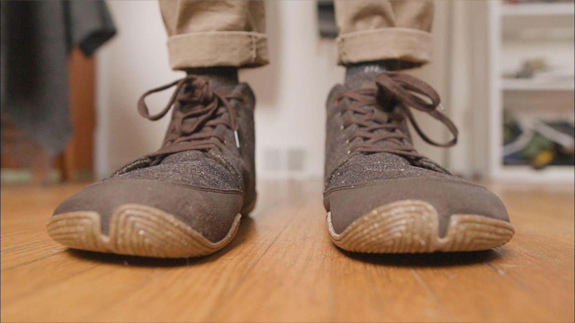 Barefoot casual shoe with a 3.5mm sole, wide cotton upper, wool lining, and minimal tread.