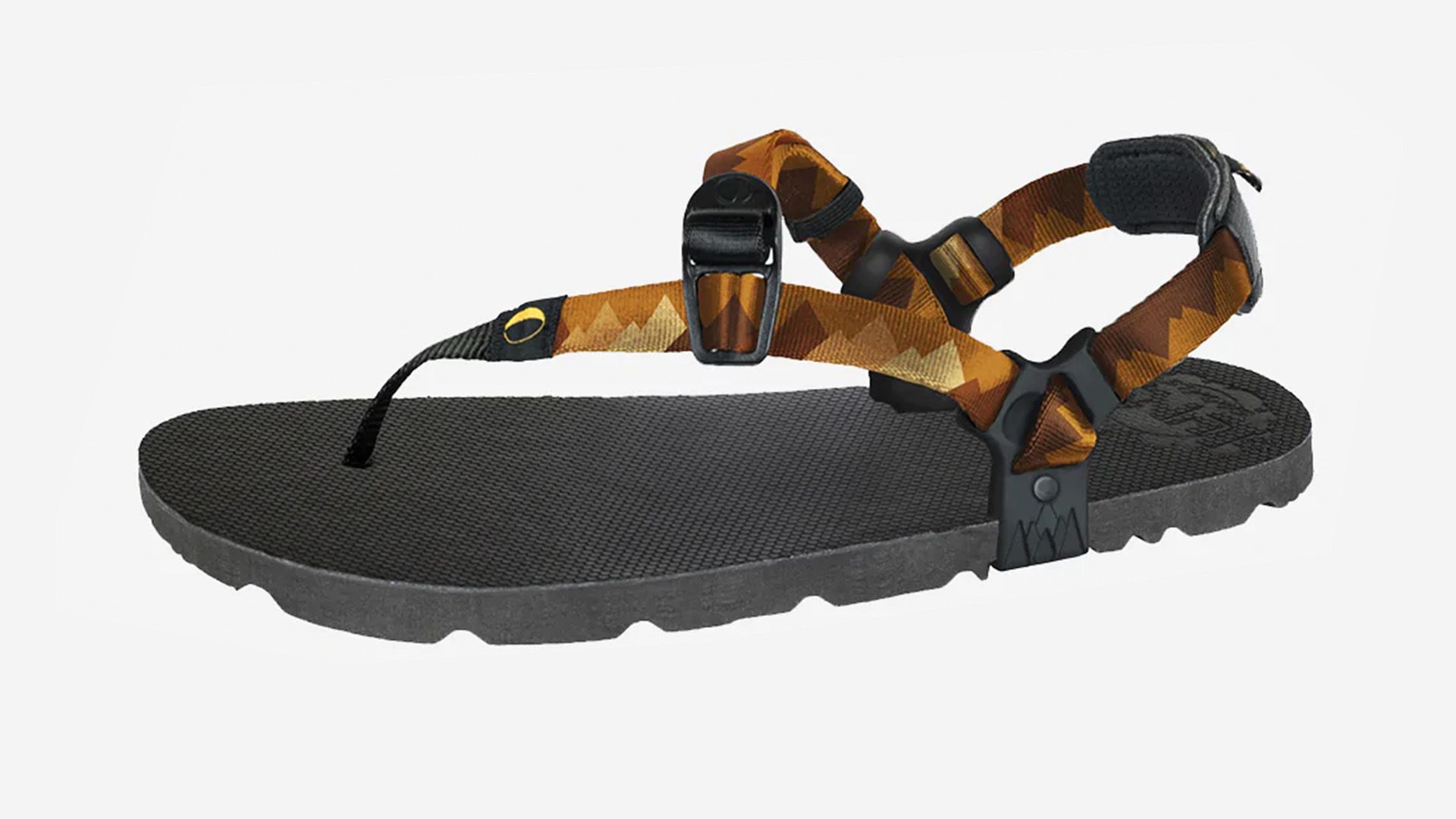 Running and hiking sandal with a thick 15mm Vibram sole, semi-aggressive tread, zero-drop footbed, and adjustable lacing system with multiple design options.