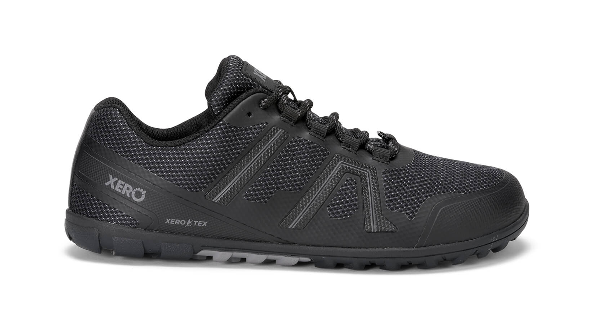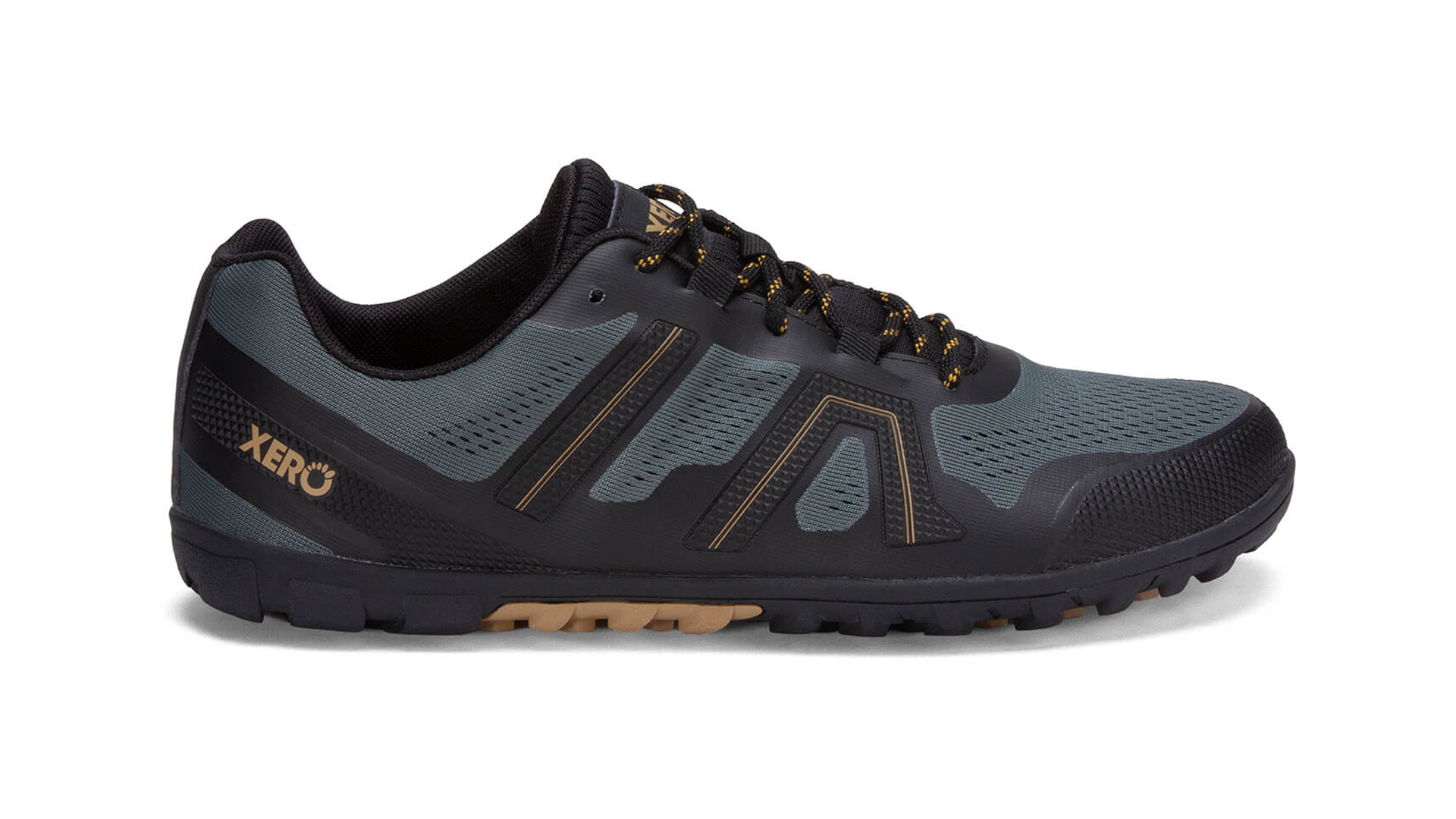 Barefoot trail shoe with a 8mm sole, wide mesh upper, and aggressive tread for soft ground.